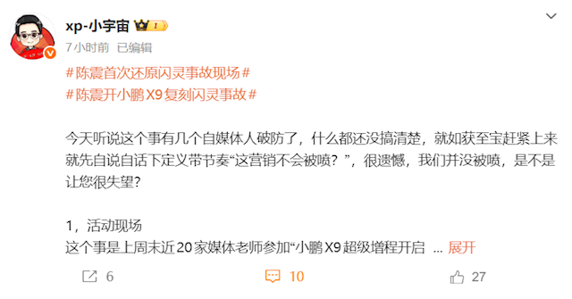陈震的此番言论,引起网友热议,并有一些自媒体博主称,小鹏的这种营销肯定会被喷。